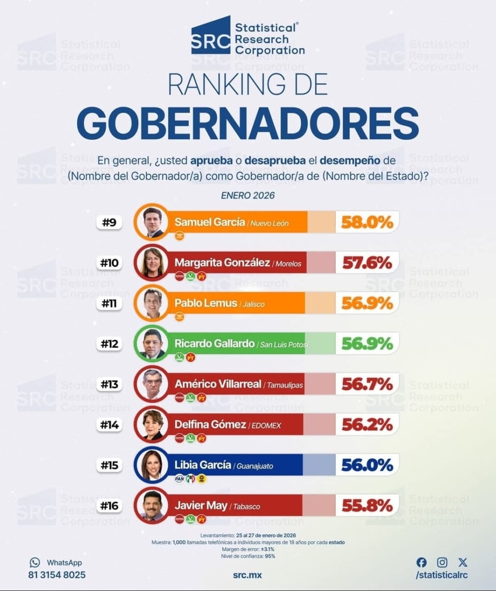 Cabe resaltar también el lugar obtenido por el gobernador de Tamaulipas, doctor Américo Villarreal Anaya, quien aparece en el lugar 13° dentro del ranking de los 32 gobernadores evaluados por SRC, con una calificación de 56.7% en enero.