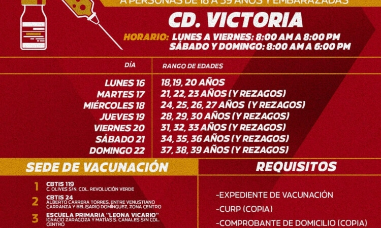 Mañana lunes 16 de agosto operarán siete puntos de vacunación para la población de 18 a 39 años de edad en Ciudad Victoria, informa el Delegado Estatal de Programas para… continúa leyendo